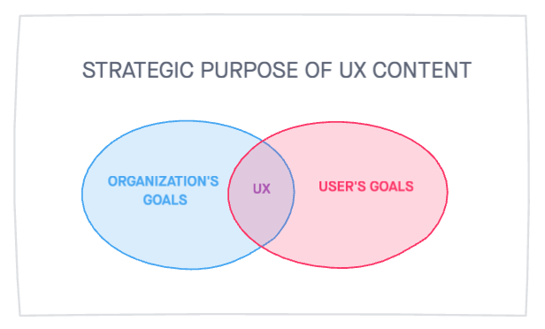 "The strategic purpose of UX content is to meet two sets of goals: the goals of the organization responsible for the experience, and the goals of the people using the experience". Strategic Writing for UX, Torrey Podmajersky.