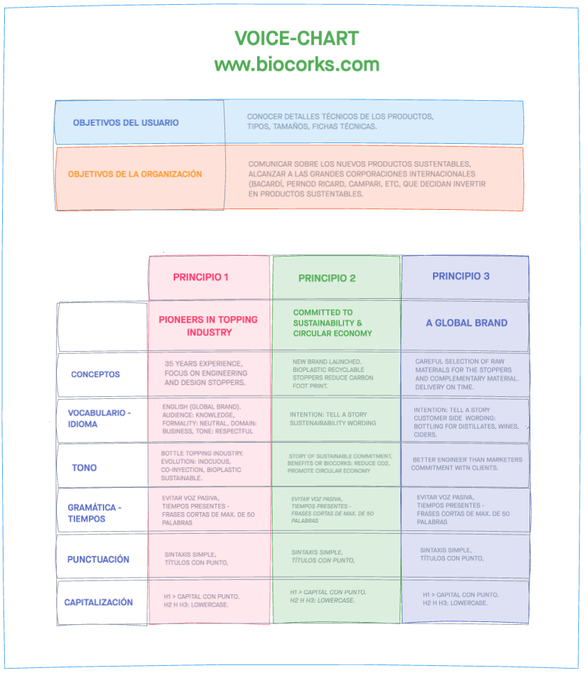 Para terminar, te dejo un ejemplo gráfico sobre la creación de un voice-chart que me guió en la redacción de los contenidos de la nueva web de Biocorks.